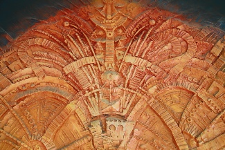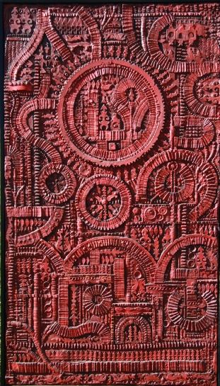 I had collected small random objects for use in the creative drama classes I was then teaching. I saw what a colleague was doing with his pupils covering textured surfaces with tin foil and then painting them. I also saw the pieces by contemporary Italian artists which were on tour in Christchurch, and relief cast iron work by a German sculptor. I used a slab of modelling clay and my collection of random objects to impress patterns into it to make a negative mould. Then I used fibre glass filler to cast the positive surface, so replicating the patterns I had created.